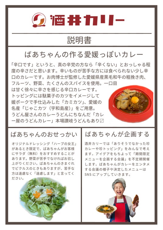 酒井興産株式会社(愛媛県新居浜市:代表取締役 酒井知子)は「人・モノ・町・食をリサイクル・リユース・リデュース・アップサイクル」を理念に掲げ、創業53年を迎える産業廃棄物処理事業者です。長年お世話になり育てていただいた地元に恩返しをしたいとの思いから、少子高齢化社会が抱える課題に取り組むべく「ばあちゃんが活躍できる場」をコンセプトに酒井カリーを立ち上げました。