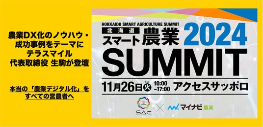 農業特化の経営管理クラウド「RightARM(ライトアーム)」を開発・提供するアグリテックスタートアップ・テラスマイル株式会社(本社:宮崎県宮崎市、代表取締役:生駒祐一)は、北海道からスマート農業を発信していくイベント「北海道スマート農業SUMMIT」のセミナーに弊社代表の生駒が登壇することをお知らせします。セミナーでは、農業特化の経営管理クラウド「RightARM(ライトアーム)」で蓄積した様々なデータ活用事例を挙げつつ「自治体編」、「農業法人編」の2つのケースにおける農業DXの取り組みノウハウと事例をお伝えします。これまでテラスマイルに蓄積された事例をもとに、データ活用で上手く行くケース・苦戦するケースなど具体的に解説します。