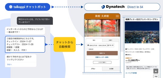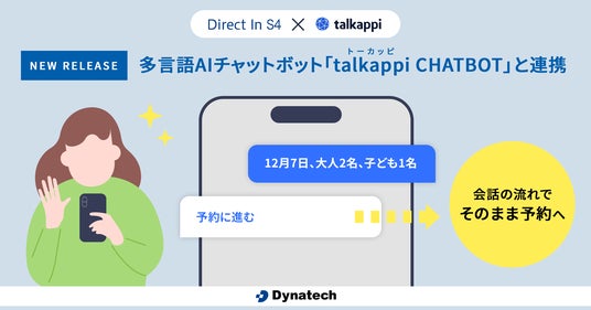 ダイナテック株式会社(本社:東京都千代田区、代表取締役社長:安房正浩)は、 2024年11月18日(月)に、宿泊予約システム「Direct In S4(ダイレクトインエスフォー、以下S4) 」において、株式会社アクティバリューズ(本社:東京都渋谷区、代表取締役社長:陳 適)が提供するホテル・旅館向けの多言語AIチャットボット「talkappi CHATBOT(トーカッピ チャットボット)」との連携を開始いたしました。