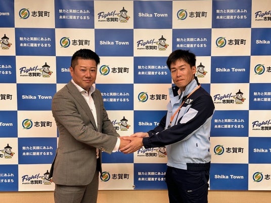 右 石川県志賀町長 稲岡 健太郎氏 左 フジパン株式会社 西春工場長 山下 洋文