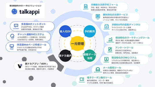 talkappiは、観光分野に特化したAI活用の顧客体験プラットフォームで、観光・宿泊施設にトータルソリューションを提供いたします。1,000施設以上に導入実績があり、利用継続率は98%以上。日本の代表的なホテルや旅館・観光自治体・観光体験事業者が多く利用しています。