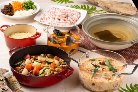 フェアメニューには、冬の時期に心も身体も温まる世界の鍋料理を提供いたします。日本の「しゃぶしゃぶ」をはじめ、白身魚やムール貝などの魚介類をトマトベースで煮込んだ南フランスの「ブイヤベース」や、鶏肉や冬瓜をココナッツミルクで煮込んだタイの鍋料理「トムカーガイ」など、世界各国の鍋料理をご用意いたします。また、ラム肉や野菜の出汁の奥深い風味が特徴で北アフリカでよく食べられる「クスクスダニョー」には、スパイスミックス「やんばるスパイス」を使用、原料の58%がウコンや島唐辛子、島ショウガなどの県産素材でできており、やんばるのスパイスの香りもお楽しみいただけます。世界の味を楽しみながら、身体を芯から温め、心もリラックスさせてくれる鍋料理をご堪能ください。