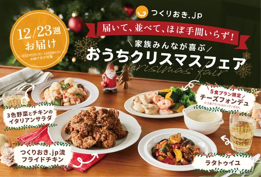 手作りおかずの宅配サービス「つくりおき.jp」では、家族で楽しむクリスマスを手軽に実現するため、「家族みんなが喜ぶ おうちクリスマスフェア」を開催します。12月23日週のメニューで、クリスマスの定番のフライドチキンをはじめ、チーズフォンデュ(5 食プランのみ提供)、ラタトゥイユ、3色野菜とチキンのイタリアンサラダをお届けします。