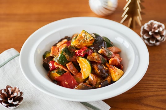 ラタトゥイユトマトベースの煮込み野菜。温めるだけで食卓が彩られます。