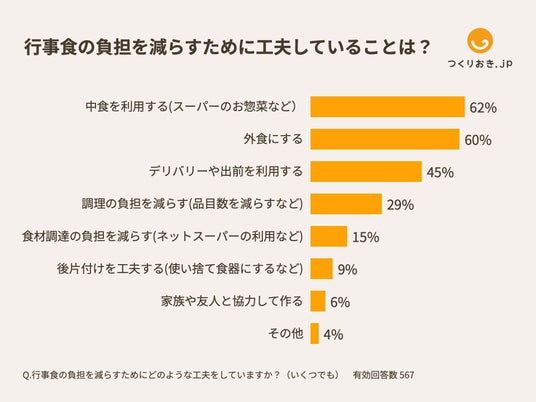 負担を減らすための工夫としては、「中食を利用する(スーパーのお惣菜など)」(62%)、「外食にする」(60%) 、「デリバリーや出前を利用する」(45%)が上位3つに挙がりました。多くの人が料理の外部サービスを積極的に活用し、行事食の準備負担を軽減していることが分かります。
