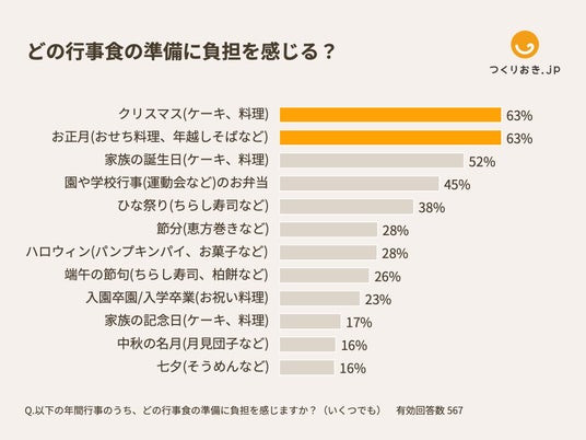 特に負担に感じる行事食としては、「クリスマス(ケーキ、料理)」(63%)と「お正月(おせち料理、年越しそばなど)」(63%)が同率1位に挙がりました。年末年始に準備負担の大きいイベントが重なっていることがうかがえます。