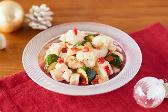 3色野菜とチキンのイタリアンサラダパプリカ、ズッキーニ、カリフラワーと色鮮やかな野菜に、こんがり焼き上げたチキンを使用したサラダです。