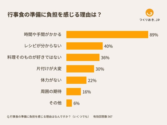 行事食の準備に負担を感じる理由として、「時間や手間がかかる」(89%)が最も多く挙げられました。次いで、「レシピが分からない」(40%)、「料理そのものが好きではない」(36%)が続いています。