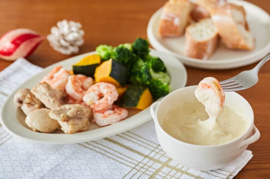 チーズフォンデュ濃厚なチーズに、バゲットやプリプリのえび、野菜をディップして楽しむ冬にぴったりの一品です。※チーズフォンデュは5食プランのみのご提供となります。