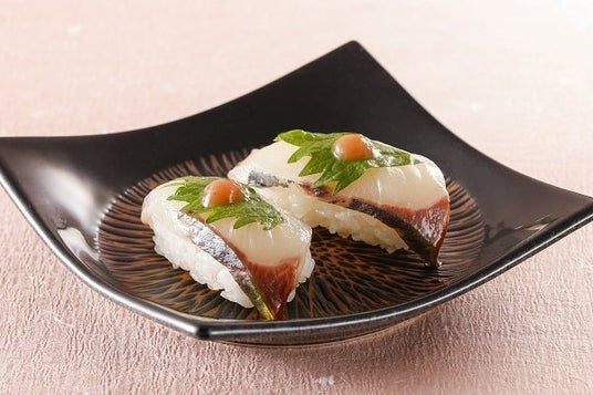 冬に旬をむかえる『金目鯛』と『縞鰺』。さっと炙った『金目鯛』はすだちをしぼって、塩で香ばしくお召し上がりください。『縞鰺』には梅肉としそを添えて、さっぱりとお召し上がりいただきます。どちらもお寿司としてもお造りとしてもお召し上がりいただけます。
