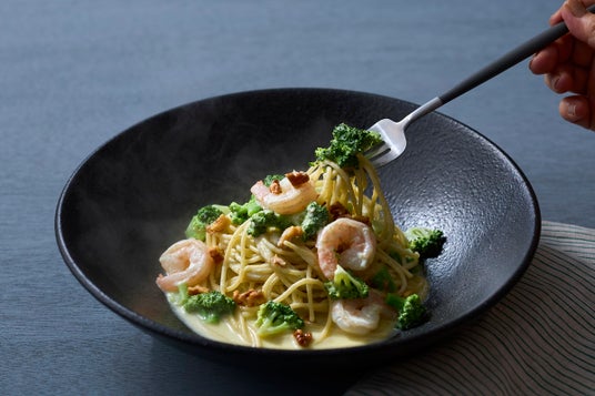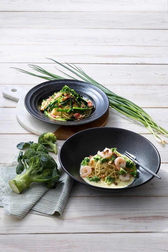 博多ブロッコリーを茎まであますことなく使ったクリームソースのパスタ。ソースはブロッコリーのうまみが溶け込んだアンチョビ風味に仕上げました。