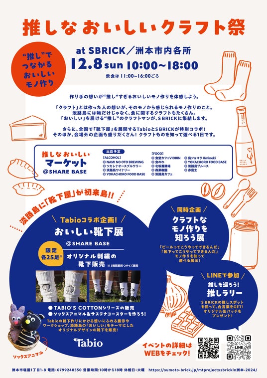 作り手の想いが“推し”すぎるおいしいモノ作りを体感しよう。「クラフト」とは作った人の想いが、そのモノから感じられるモノ作りのこと。淡路島にはモノだけじゃなく、食に関するクラフトもたくさん。「おいしい」を届ける“推し”のクラフトマンが、S BRICKに集います。さらに、全国で「靴下屋」を展開するタビオ株式会社とSBRICKが特別コラボ!タビオ株式会社の靴下作りにかける想いにふれる展示やワークショップ、淡路島の「おいしい」をテーマにしたオリジナルデザインの靴下を販売します。S BRICKのレンガ作りの居心地の良い空間に、たくさんのクラフトマンが集結。出展者とお話ができ、淡路島のいいところを見れる1日に。