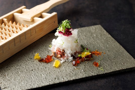 今回は、長い歴史を持ち、奥深い食文化を持つ「美(うま)し国(くに)」三重県をシェフがセレクト。三重県が世界に誇る松阪牛や伊勢えびはもちろん、三重県の郷土料理を一花一葉風にアレンジした料理をお届けいたします。先付けには、大根を竹でできた専用の鬼おろし器を使って「ガラガラおろし」にし、鰹の旨味が凝縮した「生節」とともにお楽しみいただきます。冷前菜は、「松阪牛」のモモ肉のローストビーフを、酸味をつけたリゾーニに重ね、海苔の旨味を感じる2種のあおさのソースでご賞味ください。魚料理には、三重県で親しまれている鍋料理「魚のじふ」をモチーフに、ソテーした伊勢えびや鰆、ヒオウギ貝などを醤油ベースの甘味ある出汁の中に入れ、すりおろした伊勢芋をかけてご提供。魚介の旨味が詰まった一品にいたしました。肉料理には、濃厚でまろやかな味わいが楽しめる松阪牛のサーロインを肉の旨味を引き立てる「真珠の塩」と「伊勢茶葉しぐれ」でご堪能いただきます。その他にも、三重県産ブランド米 「結びの神」で作る鯛飯や伊勢茶を入れたデザートなどをご用意。また、料理に合わせて、伊勢志摩初のワイナリーが造るワインや、伝統を重んじつつ時代の変化も捉える日本酒「作」などをお楽しみいただけます。