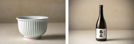 画像(左)深川製磁 しのぎ深丼 明治釉(右)伊豆本店 純米大吟醸 亀の尾