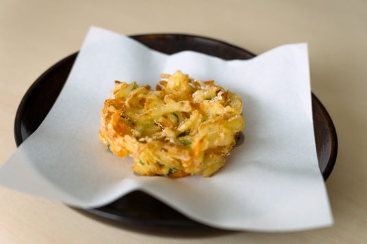 植物由来の素材だけで仕上げたヴィーガンかき揚げ。サクサクの衣に包まれた野菜の旨みが広がる一品です。