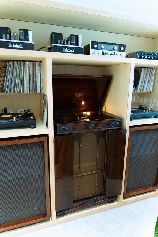 蓄音機の両脇には、JBL初期の名機、三羽烏に数えられるC-34。真空管アンプへ無駄な配線が露出しないよう配慮しました。