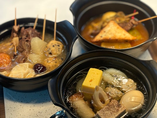 おでんのだしは、昆布とかつおの和だしをはじめ、洋食はブイヤベース、中国料理は鶏白湯と3種類をご用意。具材には、おでんの定番「大根」や「ゆで卵」のほか、和食では岩魚を使用した「つみれ」や「玉子焼き」、洋食では「ロールキャベツ」や「手作り洋風はんぺん」、中国料理では「揚げゆで卵」や「水餃子」と一風変わった具材をラインナップし、それぞれの薬味にもこだわり味変を愉しみながらお召しあがりいただきます。