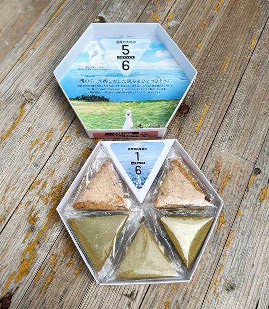琵琶湖だけが注目されがちな滋賀県ですが、琵琶湖は滋賀県の面積のわずか6分の1。その周囲には山や人が暮らす平地があり、琵琶湖と山と人の営みがつながりあって豊かな恵みをもたらしています。まだ広く知られていない滋賀の恵みにも気づいてほしい、そんな想いから「ロクブンノゴ」は誕生しました。滋賀県の6分の3を占める山を緑色の「桑のクッキー」で、6分の2を占める平地をナッツ入の「実りのクッキー」で表現。残り6分の1はキラキラと輝く琵琶湖の写真で表現しています。