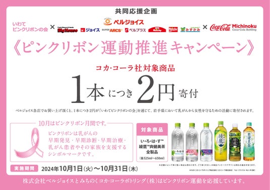 このキャンペーンは、2024年10月1日(火)~ 10月31日(木)までの期間、ベルジョイス59店舗(岩手51店、宮城7店、青森1店)で実施し、対象製品1本ご購入につき2円がいわてピンクリボンの会へ寄付され、乳がんから女性を守るための活動に役立てられるものです。このたびの対象製品は「い・ろ・は・す」、「綾鷹」、「爽健美茶」の3ブランド13品目とし、期間中の売上本数は130,230本、寄付金額は260,460円となりました。なお、2018年から開始したこの取り組みによる寄付金総額は、このたびのものを含め1,425,606円となります。