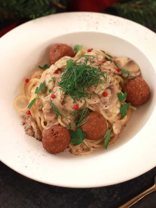 お肉を使わないのに肉汁を感じるような、ジューシーで満足感の高い “ヴィーガンミートボール”を楽しめるクリームパスタをご用意しました。
