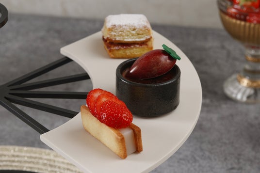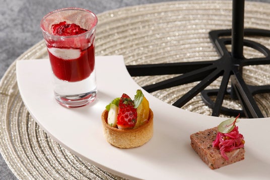 スイーツは、「苺と練乳のパンナコッタ」、「フロマージュフレーズ」、「ピスタチオと苺のスコーン」など、練乳やクリームチーズ、ピスタチオといった、いちごとの定番の取り合わせのほか、柚子の香りをアクセントにした羊羹をいちごの果実と組み合わせた和テイストな一品も。セイボリーには、ビーツやトマト、紫キャベツを用い、いちごの可憐さに負けない華やかさを演出いたしました。シャンパーニュやいちごの果実と好相性なパテドカンパーニュや、お口直しにぴったりなムースとカプレーゼは、いちごの魅力を際立たせる存在です。