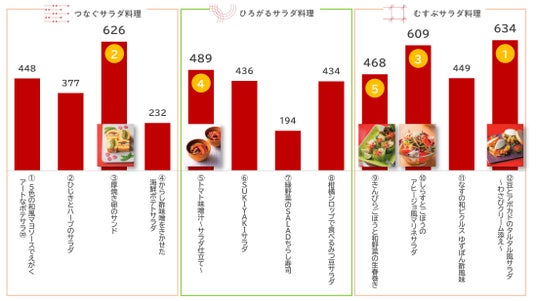今回のメインコーナーである、サラダ料理のコーナーでは「和」をキーにした、12メニューをご提案しました。その中から当日の来場者アンケートの回答で、特に“ワクワクした”と人気を集めた3メニューをご紹介します。