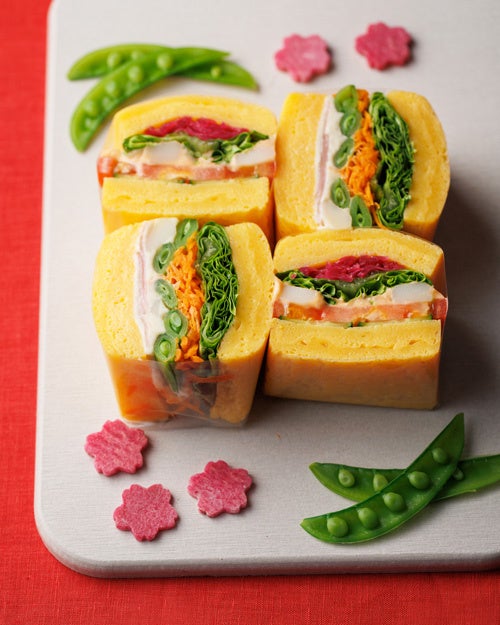 しっとりした厚焼き卵に、シャキッとした新鮮な野菜やフィリングを挟んだまるでサンドイッチのような斬新な厚焼き卵のサンドです。厚焼き卵の色合いが華やかさを演出します。