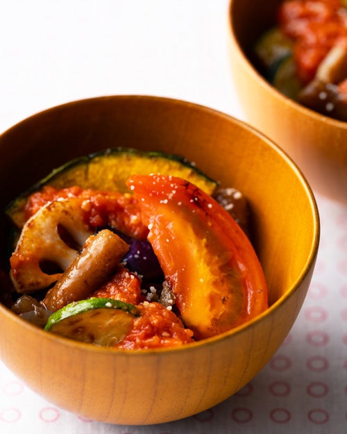 「味噌汁」を冷製のサラダ仕立てに。焼いたトマト、ズッキーニ、れんこん、かぼちゃなどを丸ごぼうの甘辛煮と和え、トマトベースの味噌ソースをかけて食べるメニューです。