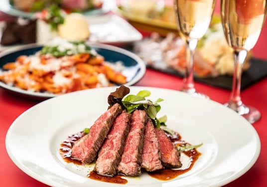 ウェルカムドリンクのスパークリングワインから始まり、心もほっこり温まる「シーフード仕立てのXmasポットパイ~クリーミーなご褒美~」やクリスマスに降る雪をチーズでイメージした「揚げ茄子と降り積もるチーズのボロネーゼ」、メインにはリブステーキが楽しめるメニューラインナップ。Xmas限定スイーツまでついた大満足の内容となっております。