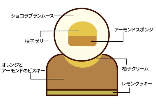 爽やかな香りとほどよい甘みの柚子ゼリーを濃厚なベルギー産ホワイトチョコレートムースで包みました。レモンクッキーと、オレンジとアーモンドのビスキーの食感がアクセントとなった一品です。