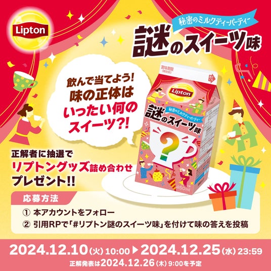 森永乳業は、世界No.1のティーブランド※「リプトン」から、「リプトン 秘密のミルクティーパーティー 謎のスイーツ味」を12月10日(火)より沖縄を除く全国にて期間限定発売いたします。さらに、X(旧Twitter)にて「謎のスイーツ味」の味を予想する「#謎のスイーツ味 フレーバー当てキャンペーン」を実施いたします。