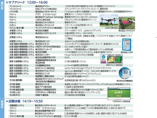 当日は、農業用ドローン等の実演、30者以上のメーカー等によるスマート農業技術関連の展示、農業者によるスマート農業技術導入事例の発表を行います。