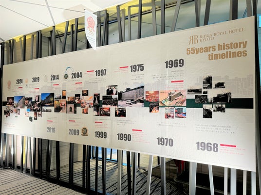 2024年11月1日(金)にリーガロイヤルホテル京都は開業55周年を迎えました。訪れるお客様をお出迎えする1階ロビーには鮮やかな深紅のバラが目を引くフラワーウォールを設置し、フォトスポットとしてもお愉しみいただける装飾を施しています。同じく1階北入口付近には、55年の軌跡を記した年表を展示し、リーガロイヤルホテル京都がこれまで歩んできた歴史を時代背景とともにご覧いただけます。