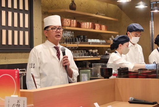 また、統括料理長の岩根和史は、東西の文化の違いとして、江戸雑煮と京風雑煮について解説。白味噌を使う京雑煮は、「何事も円満に」という意味でまろやかなみそや丸い餅を使っているとされるのに対し、江戸雑煮は武家社会を反映し、勝負に「みそをつける」ことを避けるため醤油ベースを採用していること、また「敵をのす」ような形の角餅を使っていることなど、ゲン担ぎの要素が強いことも語りました。