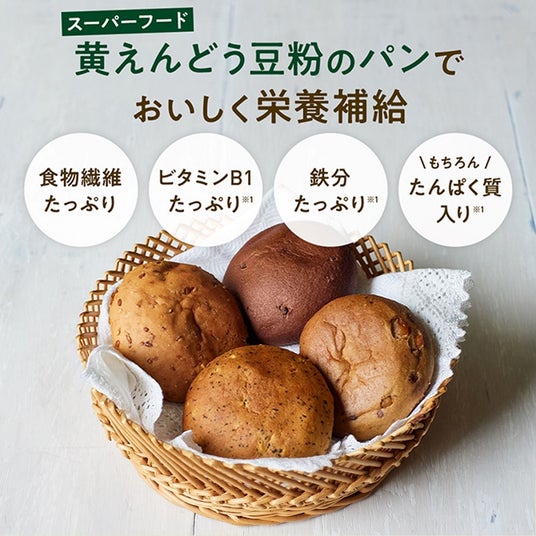 うす皮までまるごと、スーパーフードの黄えんどう豆を使用して、おいしさだけではなく栄養も余すことなく活かしています。食物繊維や鉄分、ビタミンB1がたっぷりで、もちろんたんぱく質入り、カロリーは1袋138kcalでいつものパンより糖質35%オフ※3だから、我慢せず食べ続けられるカラダにやさしいパンです。ダイエット中や腸活中の栄養補給にもおすすめです。