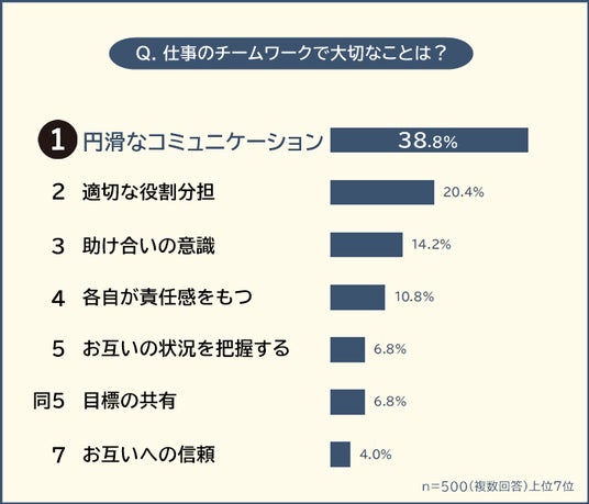 お仕事をしている500人に「仕事のチームワークで大切なこと」を聞いたところ、1位は「円滑なコミュニケーション(38.8%)」でした。2位「適切な役割分担(20.4%)」、3位「助け合いの意識(14.2%)」が続きます。
