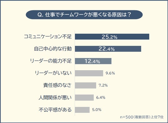 また2位「自己中心的な行動(22.4%」、3位「リーダーの能力不足(12.4%)」、5位「責任感のなさ(7.2%)」など、輪を乱す人がひとりでもいるとチームワークが悪くなると考える人も多くなりました。