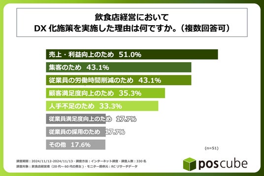 次に、飲食店経営において何らかのDX化施策を実施していると回答された方に「飲食店経営においてDX化施策を実施した理由は何か」を問う設問の回答では、1位が「売上・利益向上のため」で51.0%、2位が同率で「集客のため」と「従業員の労働時間削減のため」が43.1%で並ぶ結果となりました。この結果から集客や売上・利益向上のためにDX化施策を実施している方が多いことがわかりました。