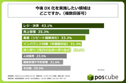 次に、飲食店経営において何らかのDX化施策を実施していると回答された方に「今後DXを実施したい領域はどこか」を問う設問では、1位が「レジ・決済」で43.1%、2位が「売上管理」で35.3%、3位が「集客」で33.3%という結果になりました。この結果から、売上・利益の増加に直結する領域でのDX化を検討されている方が多い、ということがわかりました。