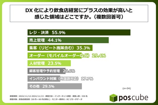 また、DX化施策の実施により経営へのプラスの効果を感じると回答された方に「DX化により飲食店経営にプラスの効果が高いと感じた領域はどこか」を尋ねる設問の回答では、1位が「レジ・決済」で55.9%、2位が「売上管理」で44.1%、3位が「集客」で35.3%という形になりました。この結果から、DX化施策により最も経営にプラスの効果を感じている方が多い領域は「レジ・決済」であることが明らかになりました。