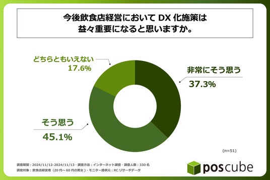 調査の最後、飲食店経営において何らかのDX化施策を実施していると回答された方に「今後飲食店経営においてDX化施策は益々重要になると思うか」を尋ねる設問への回答で多かったのは、1位が「そう思う」で45.1%、2位が「非常にそう思う」で37.3%という結果になりました。1位と2位の回答を合計すると回答率は80%を超え、この結果から飲食店経営において何らかのDX化施策を実施している経営者の8割以上が今後の飲食店経営においてDX化施策は益々重要になると考えていることが明らかになりました。