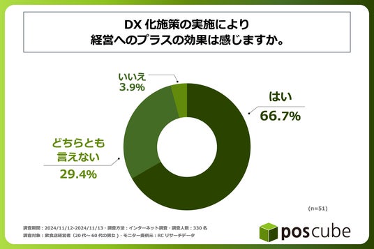 続いて、飲食店経営において何らかのDX化施策を実施していると回答された方に、「DX化施策の実施により経営へのプラスの効果を感じるか」を尋ねる設問への回答では、「はい」が66.7%、「どちらともいえない」が29.4、「いいえ」が3.9%という結果になりました。この結果から、否定的な評価は少なく、6割以上の方がDX化施策の実施により、経営へのプラスの効果を感じていることが判明しました。