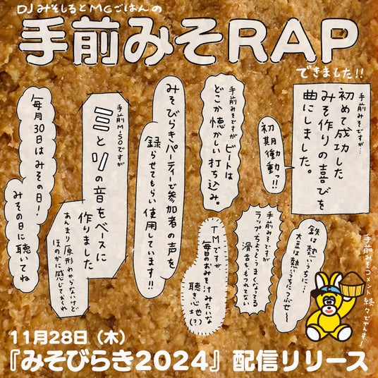 そのイベントでみその実食と共に初披露されたのが、今回リリースする新曲『みそびらき2024』です。みそ作りの魅力や微生物による発酵・熟成の様子をラップで伝え、一見ハードルが高そうな昔ながらの手仕事を身近に感じることができる楽曲となっております。80’sを感じる打ち込みサウンドは新しくも懐かしい仕上がりになっており、毎日のおみそ汁のように心地よく耳に染み入ります。