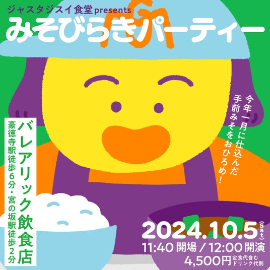 2024年10月、くいしんぼうヒップホッパーのDJみそしるとMCごはん(以下「おみそはん」)が、料理やお菓子の製作・販売を行うHANDの竹田千賀子さんと共に仕込んだ手前みそをお披露目する『みそびらきパーティー』を東京都世田谷にあるバレアリック飲食店で開催いたしました。