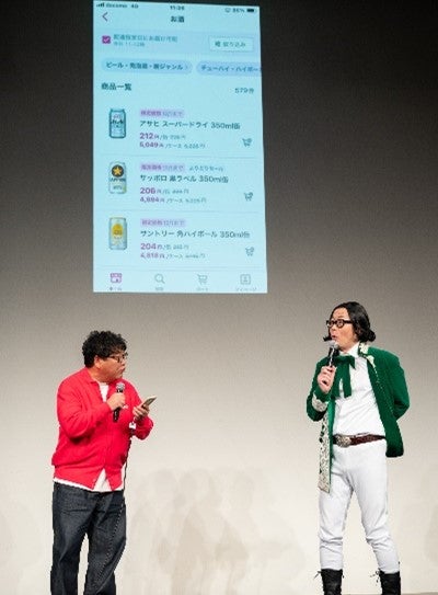 イベント冒頭では、当社取締役の飯沼勇生が登壇し、リニューアルのポイントについて利便性の向上と直感的な操作性を追求した点に加えて、今後の展望としてアプリを通じてさらなる購買体験の向上をしていくことについて説明しました。ゲストのカンニング竹山さん、髭男爵のひぐち君が登壇したトークショーでは、カクヤスでアルバイト経験がある竹山さんが「若い頃、幡ヶ谷店で働いていたことをよく覚えています。配達先でお客さんとの会話で培ったコミュニケーションが、今の仕事で活かせています。」とお話いただきました。