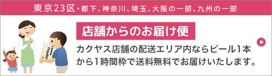 創業100年以上の老舗酒屋グループである「なんでも酒やカクヤス」は、東京23区を中心に横浜や大阪などに店舗を展開しています。家庭向けと飲食店向けのお客様に向けて酒類を中心とした飲料、食品、日用品などを販売しています。店舗を展開する東京23区を中心とする一部地域であれば、お客様のご自宅をはじめ、指定する場所へビール1本から、即日で無料配達が可能です。