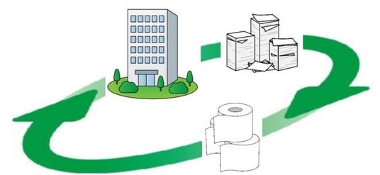 オフィスの廃棄書類が製紙工場でトイレットペーパーに再生され再びオフィスなどで利用