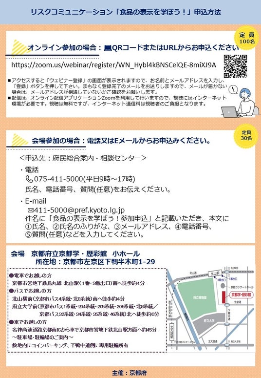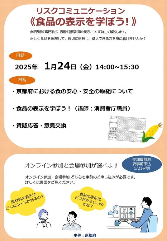■京都府では、府民の皆様が正しく食品を理解して適切に選択し購入できるように、講習会(リスクコミュニケーション)「食品の表示を学ぼう!」を1月24日に開催します。