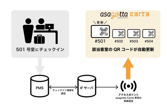 PMS連携により、各ゲストの情報を紐づけた個別QRコードをasagotta cartaに表示することで、ゲストのスマートフォンを介して様々なサービスを提供することが可能になります。