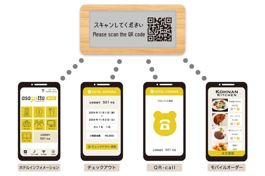 ゲストが客室でQRコードを読み込むだけで、スマホからホテルインフォメーションをご利用いただけるようになります。